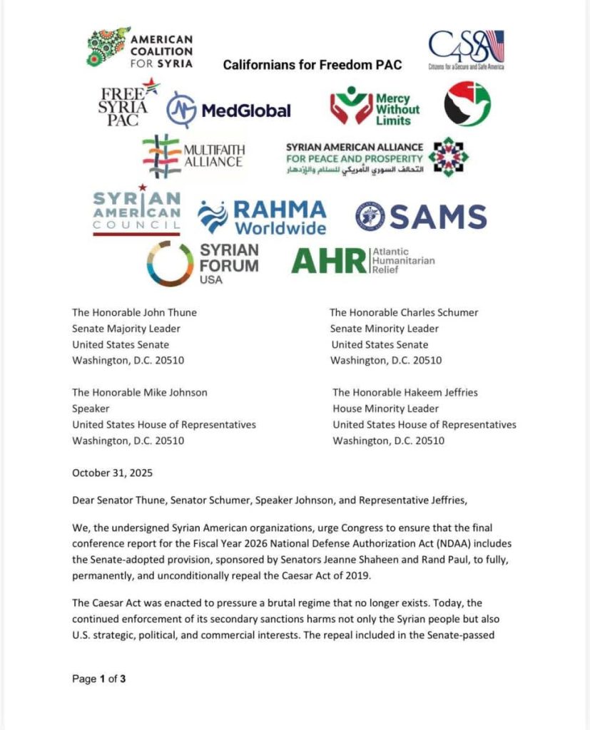 وقّع المنتدى السوري إلى جانب عددٍ من أبرز المنظمات السورية الأمريكية رسالةً مشتركة وُجّهت إلى قادة الكونغرس الأمريكي، دعت إلى الإلغاء الكامل وغير المشروط لقانون قيصر لعام 2019 ضمن قانون تفويض الدفاع الوطني (NDAA) للسنة المالية 2026.