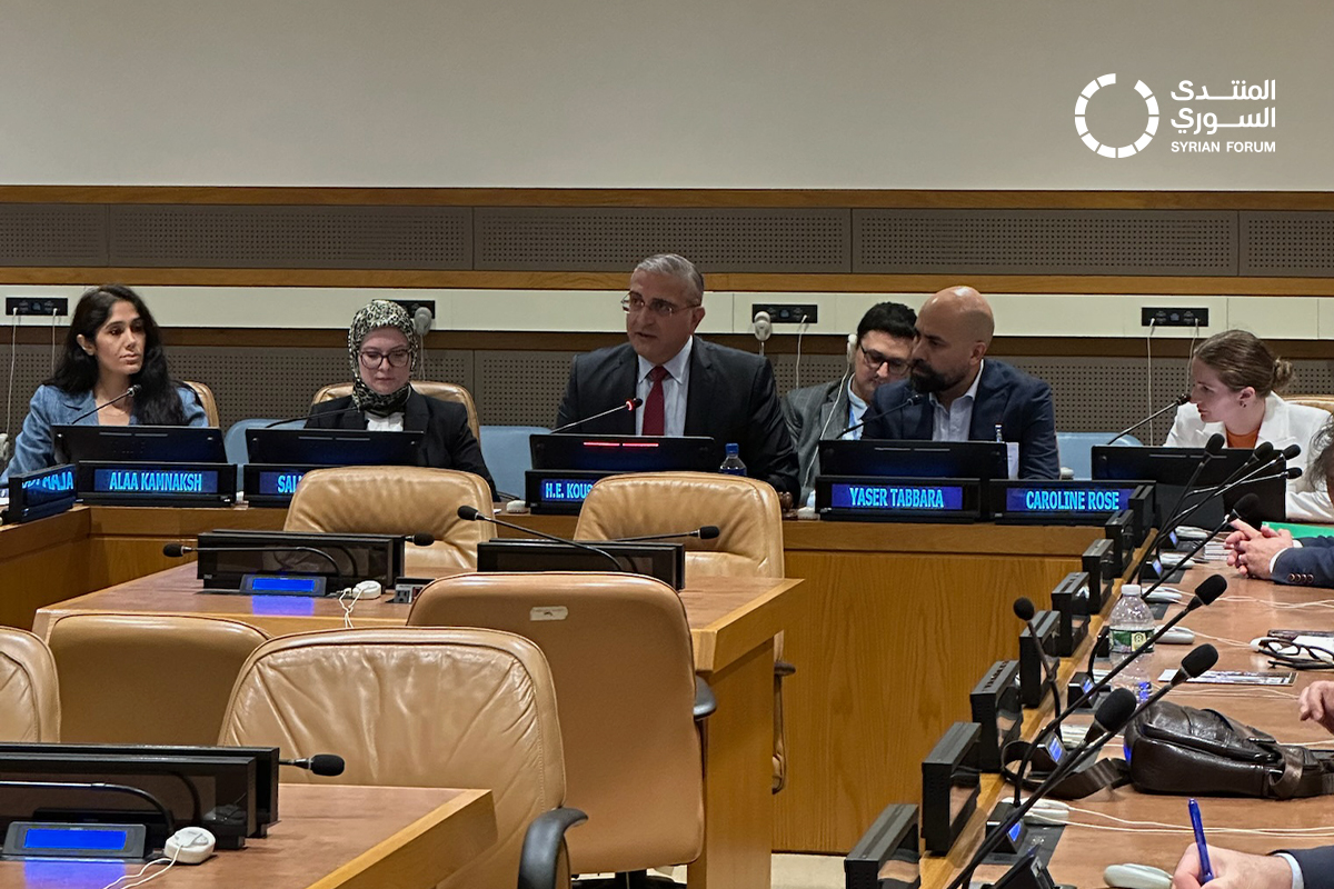افتتح الجلسة سعادة السفير قُصي الضحاك، المندوب الدائم للجمهورية العربية السورية لدى الأمم المتحدة، لتبدأ بعدها النقاشات بثلاث مداخلات مترابطة تناولت أدوار المرأة في مختلف مستويات المرحلة الانتقالية. قدّمت سالي شوبط Sally Shobut، المبعوثة الخاصة لوزارة الخارجية والمغتربين في الجمهورية العربية السورية Mofa – Syria لدى الأمم المتحدة United Nations، مداخلة حول المصالحة وبناء السلام المحلي، تلتها كارولين روز، مديرة ملفات “الجرائم والنزاع” و”الانسحابات العسكرية” في معهد نيو لاينز New Lines Institute for Strategy and Policy، التي تناولت تمكين النساء من خلال المجتمع المدني والتحديات المرتبطة به، ثم ياسر تبارة، رئيس التخطيط الاستراتيجي في المنتدى السوري، الذي ناقش الحاجة إلى حوكمة شاملة تضمن تمثيلاً حقيقياً للنساء. أدارت الجلسة الباحثة آلاء كم نقش من مجموعة زنوبيا الاستشارية وأسهمت في ربط المحاور وصياغة المخرجات، في تأكيد على أن مشاركة النساء ضرورة لصياغة مستقبل سوريا.
